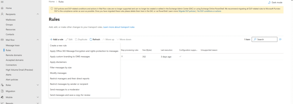 For more specific needs, you can use mail flow rules in the admin center. This involves setting conditions for automatic encryption.